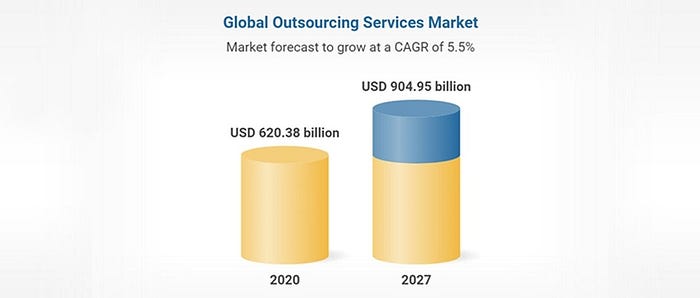 As per research and market reports, the global market for outsourcing services is expected to expand at a compound annual growth rate(CAGR) of 5.54% during the forecast period 2020–2027, leading to a total market size of US$904.948 billion by 2027.